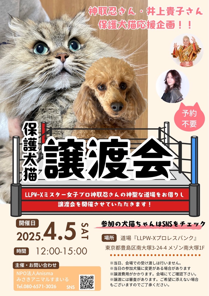 4月5日(土)|神取忍さんの神聖なプロレスの道場をお借りし、保護犬猫の譲渡会を開催します!