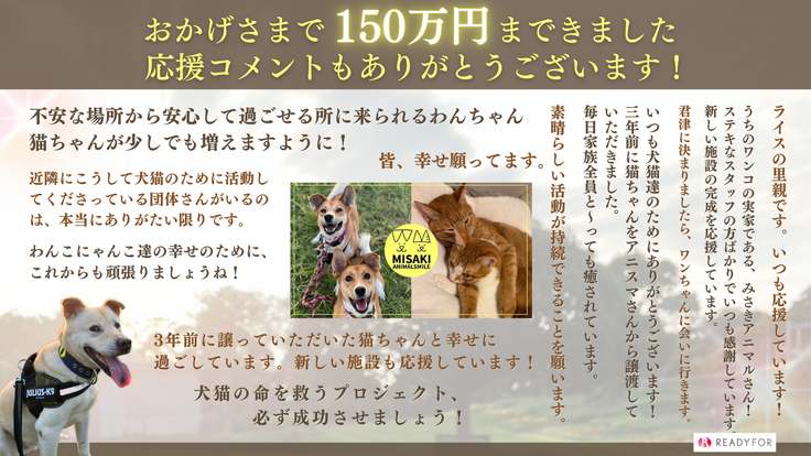 おかげさまで150万円まできております。目標金額1,900万円達成を目指して…!