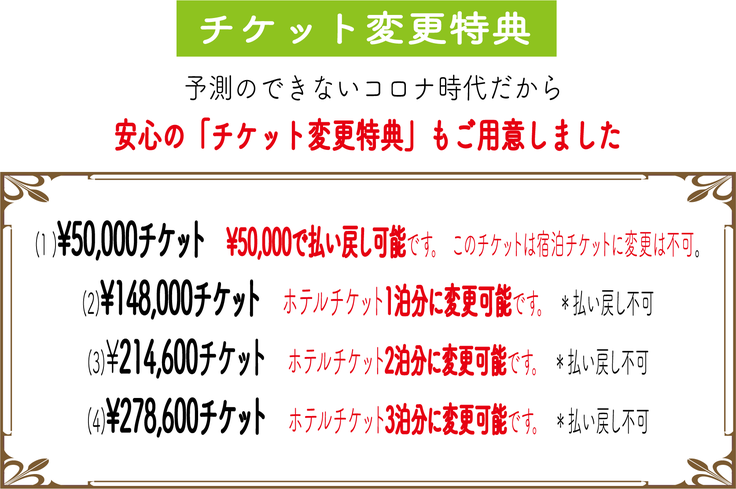 *万が一挙式をあげられ無い場合は、チケットの有効期限内であれば¥50,000でチケットの買い戻しも可能です。