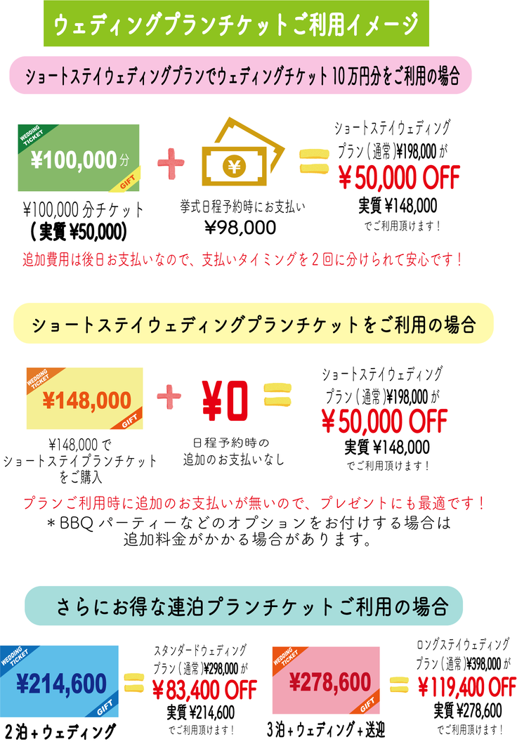 ショートステイ、スタンダード、ロングステイの各ウェディングプランで¥100,000分としてご利用頂けるチケットです。ご購入者には¥50,000のリターンとなります。