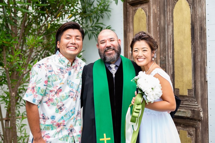 結婚式を挙げたカップルとの記念撮影の一枚。
