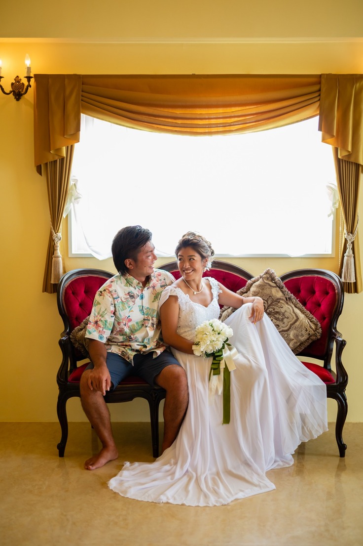 挙式のシーンから撮影をスタートし、挙式後に敷地内や客室内及び目の前のビーチにてロケーション撮影を行います。(*雨天時は室内での撮影となる場合もございます。)