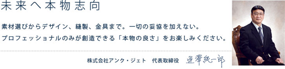 社名のアンク・ジェトとは、古代エジプト語で『永遠の生命』という意味です。何代にも渡って、お客様に爬虫類革の魅力と日本製バッグの価値を届けていきたい、愛着を持って使い続けて頂きたいという想いで作り続けています。