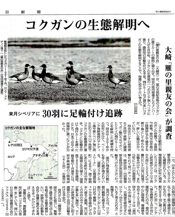 今夏に予定しているコクガンの調査が毎日新聞で紹介されました
