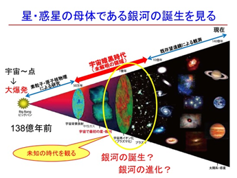 銀河の誕生を調べるには宇宙のはるか遠方を観測する必要があります。我々の住んでいるこの宇宙は、最初はほぼ点だったと考えられています。それが約138億年前に大爆発(ビックバン)を起こして急激に膨張し、冷えて原子ができ、分子ができ、ガスができてそれらから星が生まれ銀河が誕生したと考えられます。その銀河誕生の時期はわかっていませんが、約130億年~135億年ほど前のどこかではないかと推測されています。南極望遠鏡ではそこを見たいと思っています。今でも可視光では100億年以上先~132億年ぐらいまで見えていますが、そこにある銀河の数は理論的に予想されている銀河の数の1~2割程度であり、7割以上の銀河が足りません。本当に無いとすれば大きな問題ですが、無いのか見えていないだけなのか?そのような、光では見えていない「暗黒銀河」は電波(テラヘルツ波・サブミリ波)では発見できるはずだというのが南極テラヘルツ望遠鏡推進の考えです。