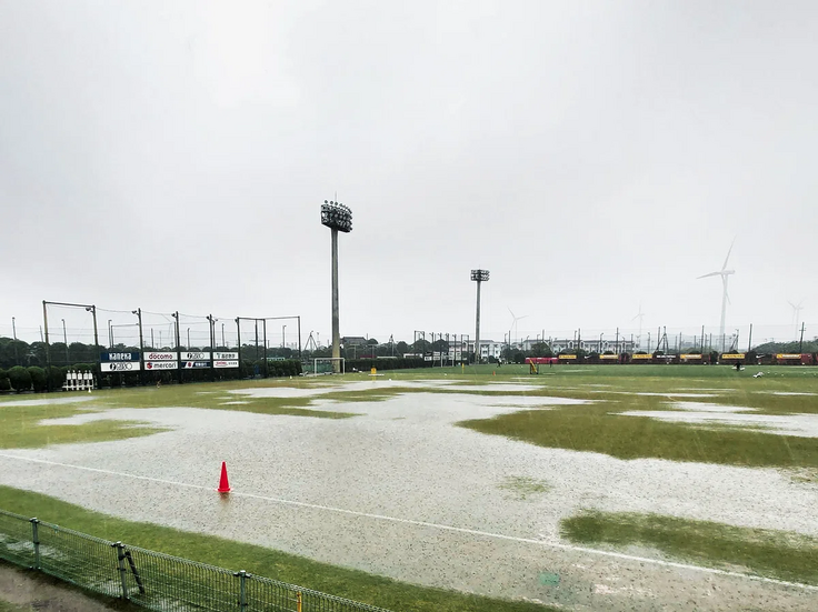 同じ雨の量でもカシマスタジアムのグラウンドとクラブハウスのグラウンドでは水たまりの量は明らかに異なり、スタジアムではほとんど水たまりが出来なくても、クラブハウスでは大きな水たまりがたくさん出来てしまっているのが現状です。