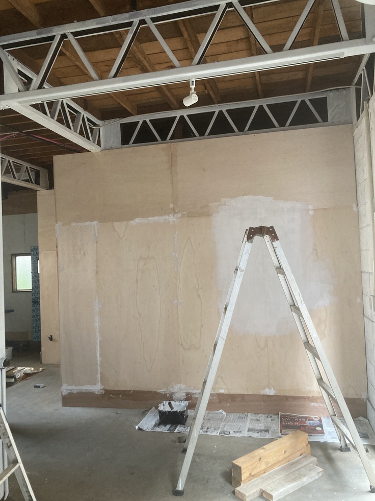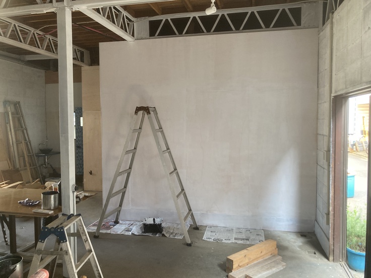 本日は暑日が戻ってきたような暑さでしたね。午後から壁面の塗装作業を行いました。下地を塗り、一度塗り。明日は仕上げをしたいと思います。
