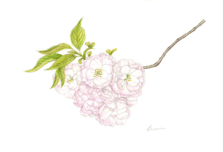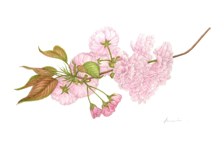 この桜のボタニカルアートは、江戸時代に東京 荒川提を美しく彩った『江北の五色桜』として江戸の町民たちに愛されていたサトザクラの一つ『弁殿(ベンドノ)』です。日光山より発祥した桜と伝わっている品種です。ここに掲載した絵は京都府立植物園にてスケッチした桜で、日本植物園協会が認定するナショナルコレクションに登録されています。東京 荒川提にあった桜が京都の植物園に植樹された経緯は下記の通りですが、桜がご縁をつないだとしか思えない不思議な道のりでした。
