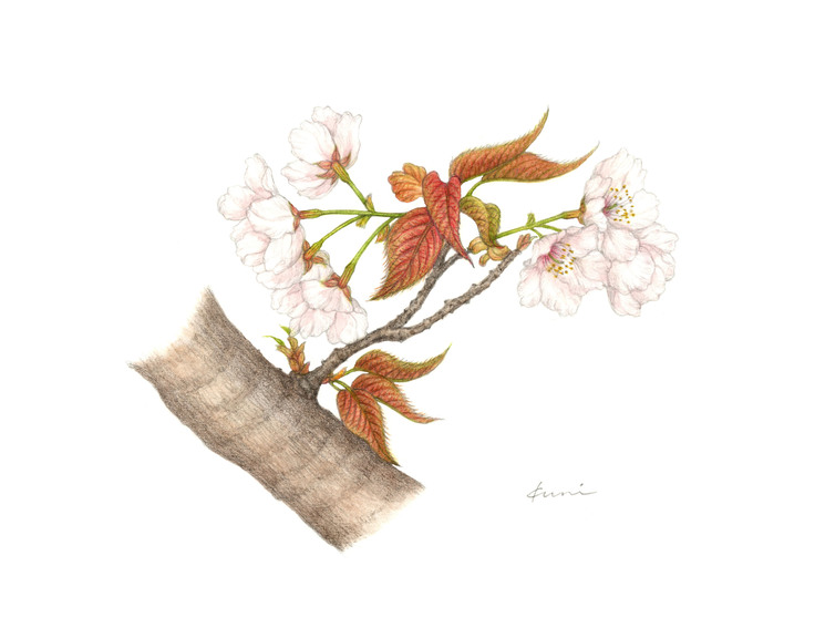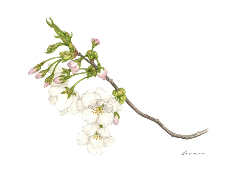 日本一大きな花を咲かせる桜として有名なタイハクは、京都府立植物園と二条城の桜園にてスケッチしました。一度は日本では絶滅した桜でしたが、1930年に来日した英国の桜研究家コリングウッド・イングラムがこの桜の絵を見て、ご自身の庭で栽培しているものと同じだ!と日本に里帰り出来ました。世界中にも桜を愛する人々がいることを本当に嬉しく感じた逸話です。