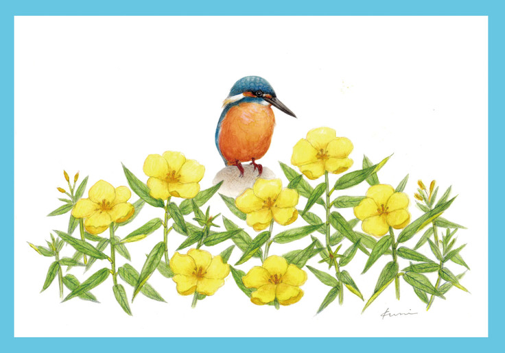 夏の琵琶湖に咲いていた黄色い花に気持ちよさそうに飛び込むカワセミの様子に感動して描きましたが、後にこの花が駆除の対象になっている外来水生植物だと知りました。
