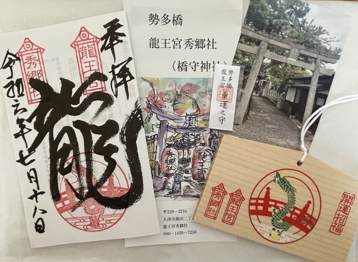宮司様によると、もとは現在の唐橋の場所にこちらの神社があったと言われ、その湖底から発見された弥勒菩薩も橋の袂にお祀りされています。