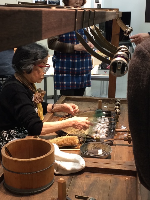 写真は、先日企画展で行った小此木エツ子氏による諏訪式の実演です。貴重なお話をいただき、器械繰糸の基本機構を学ぶことが出来ました。
