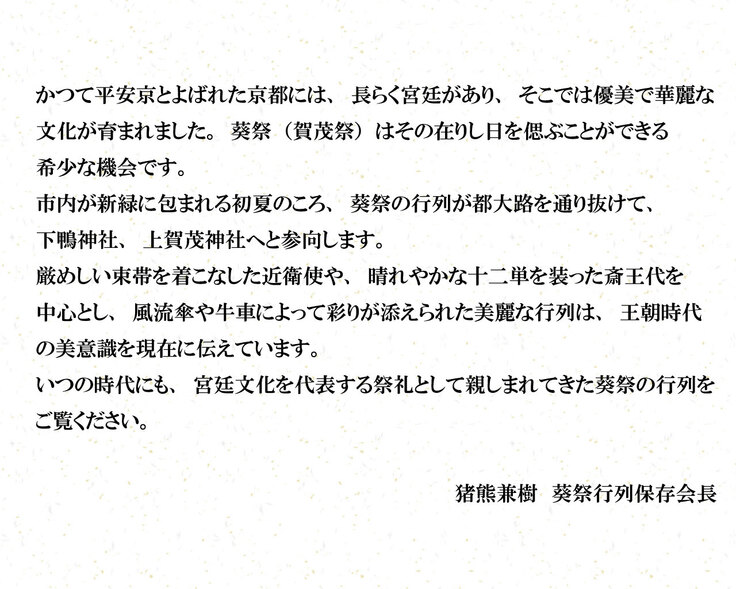 行列保存会長の猪熊兼樹さんから今回のプロジェクトへのメッセージです。