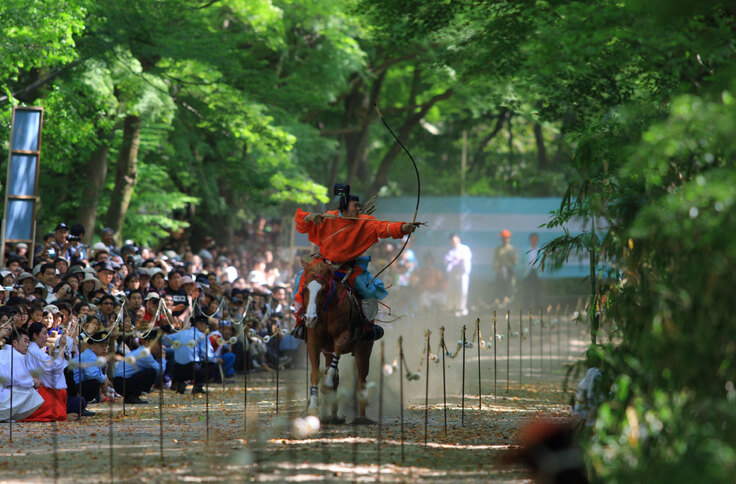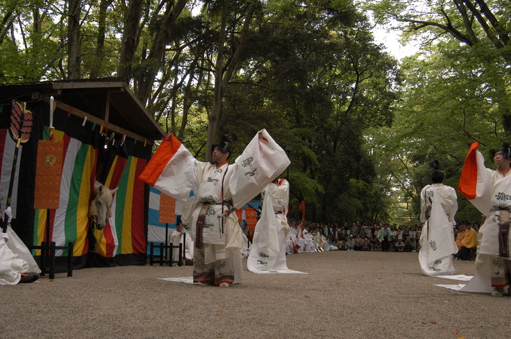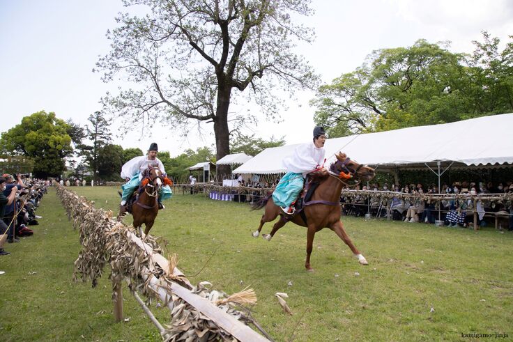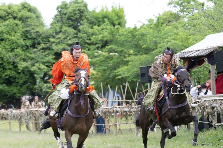 馬を走らせながら騎手が矢で的を射ぬく神事。境内の糺(たたず)の森の馬場で、騎手が妙技を披露する。糺の森に設けられた全長350メートルもの馬場に100メートルおきに設けられた3カ所の的を、つぎつぎと矢で射ぬいていく。