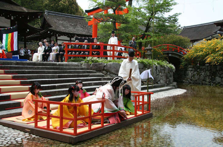 葵祭の斎王代(さいおうだい)と女人列に参加する女性が身を清める神事。毎年、上賀茂神社(京都市北区)と下鴨神社(左京区)の交代で行われる。斎王とは平安朝時代未婚の内親王や女王が選ばれて奉仕した。現在は代理として京都在住の一般市民から選ばれた女性が務め、十二単を着て境内の川や池で水に手を浸して身を清める御禊を行う。