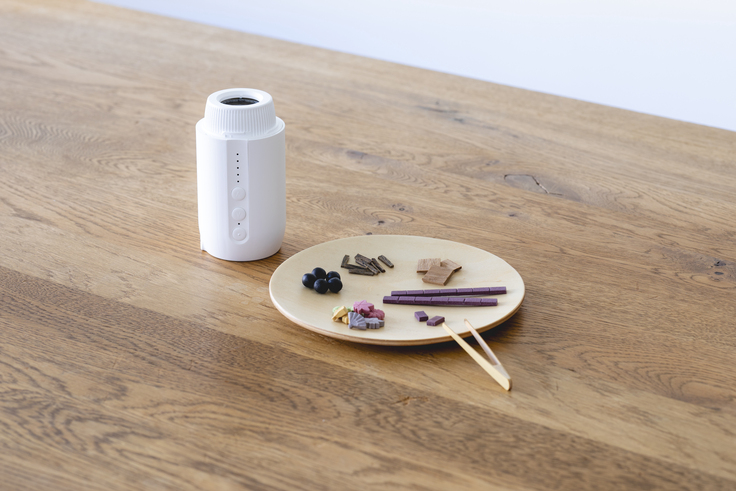 香りの老舗「松栄堂」が2024年4月に発売する新商品「ひとたき香炉こづつSARA(充電式電気香炉)」。さまざまなタイプのお香(練香・印香・香木)を温めることで香りを広げる電気香炉です。平安時代に貴族が好んだお香文化を楽しんでいただくために、「フタバアオイ」のロゴを入れた今回のプロジェクト限定商品です。