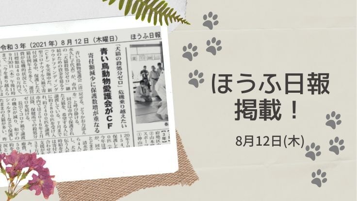 8月12日(木)のほうふ日報にクラウドファンディングについての取材記事が掲載されました!青い鳥動物愛護会の拠点である防府市の新聞ということで、里親様や地域の方からも「見たよ!」とお声がけいただきました。ありがとうございます♪