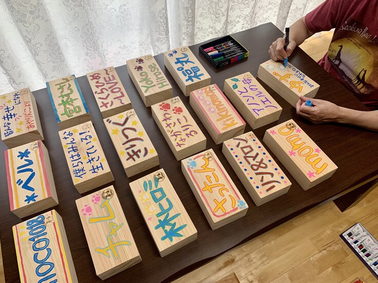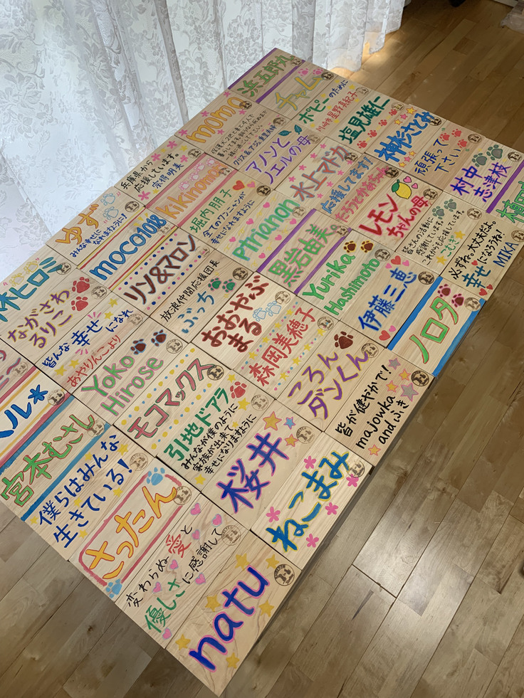 ■ 木レンガ:お名前やメッセージを書いて、シェルター敷地内の壁に貼ります。皆さんの分身にシェルターを見守っていただきます。(希望制)