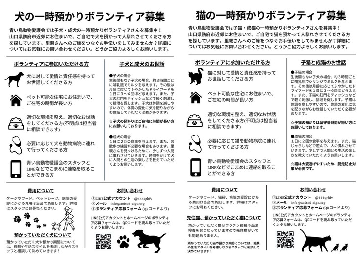 預かりにかかる費用は当会が負担し、預かり中に不明点は担当者に相談することが可能です。ご興味のある方はお気軽にお問い合わせくださいませ。どうかご協力よろしくお願いいたします。