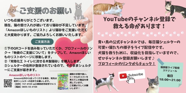 いつもありがとうございます!支援物資は和字シェルターの住所に送っていただくようお願いします。※こちらのAmazonほしい物リストからご注文いただくと、シェルターに物資が届くようになっています。猫の受け入れが続いており、猫砂が不足しています。ご協力お願いいたします。