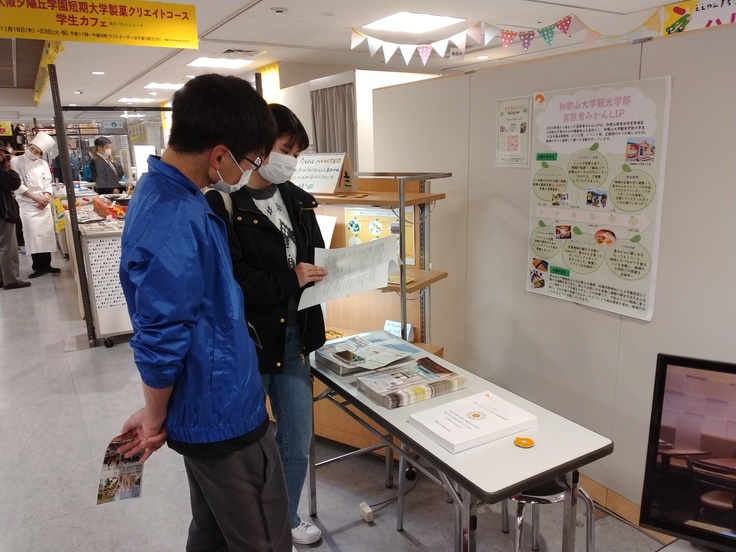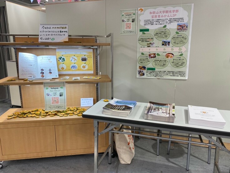 学園祭2日目の11/19、会場に到着するとすでにさまざまな大学の個性あふれるブースが並んでいました。どれも目を引くものばかりで、各団体の方が一生懸命準備されてきたものを見ているのはとてもわくわくしました。また、同じ青みかんを使った商品開発をされている団体もいらっしゃり、活動を報告し合う中でさらなる刺激を感じることができました。私たち和歌山大学観光学部宮原青みかんLIPのブースでは、各班のこれまでの活動の成果、そしてこれからの活動予定をそれぞれ展示させていただきました。私たちの活動をこのような形で表すことができて良かったと思うと同時に、この活動の今後の可能性を再確認しました。これからも活動に励み、もしまたこのような機会をいただける機会があれば、より成長した青みかんLIPの活動をお見せしたいと思います。