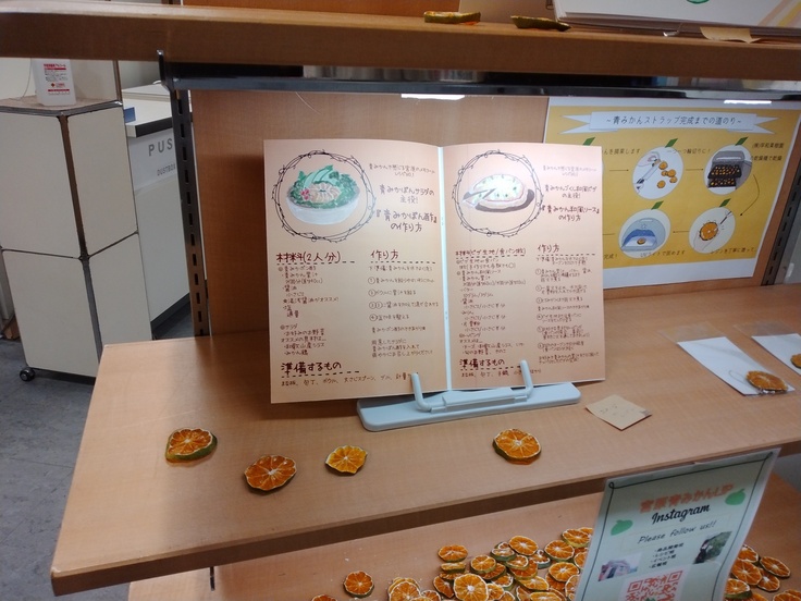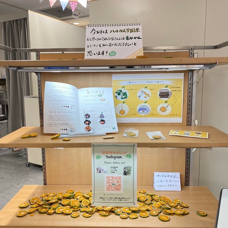 ハルカス学園祭に参加させていただいたことで、自分たちが行っている活動について多くの方に知ってもらう良い機会となりました。来場者の方で「和歌山といえばみかん」というイメージをもつ方は沢山いらっしゃいましたが、生産過程で青みかんというみかんが破棄されているということを知っている方は少なかったです。青みかんの活用方法をお話すると多くの方が興味をもってくださりました。青みかん料理の写真を見て食べてみたいと言ってくださる方もいらっしゃったので、将来的には外部の方を招いた試食会の開催も企画したいです。また、普段は交流することのない他大学の学生さんとも交流ができ、刺激を受ける良い機会になりました。他大学の方とも協力をして資源を有効的に使っていけるような取り組みを展開していければおもしろいと思うので、今後も精一杯活動していきたいと思います。