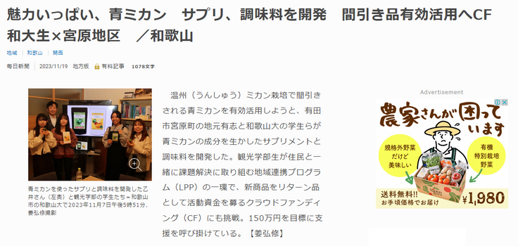 一方、本来は間引きされる青ミカンの活用が目標だが、農薬管理の課題が残り、今回の2商品は無農薬で専用栽培した青ミカンを原料とした。24年度末で終了するプロジェクトでは、他の商品アイデアの実現に加え、農薬管理の具体化が今後のテーマとなる。
