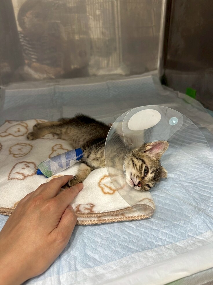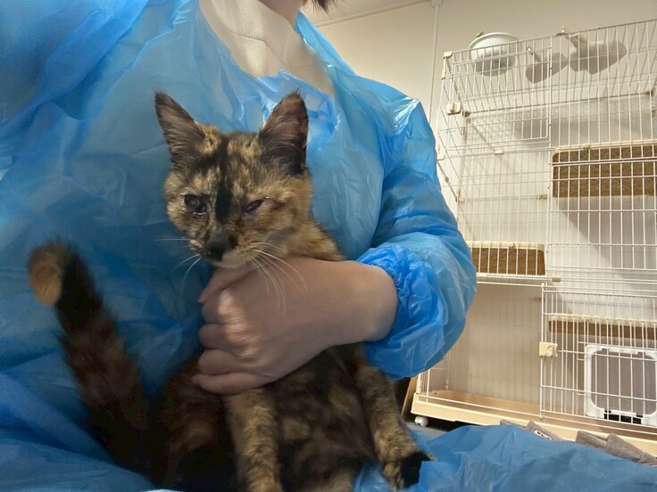 このサビ猫ちゃんは、重度の風邪で鼻血が出て目が溶けかかっていて4時間おきに目薬などの投薬が必要でしたが、今は元気で努力の甲斐あり眼球も摘出せずに済み、可能な限りの治療も完了しております。
