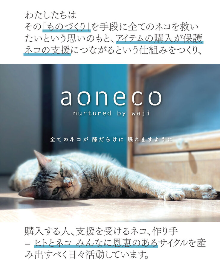 「全てのネコが隙だらけに眠れますように」をモットーに、ものづくりを通して保護ネコ支援を行なっている、 aonecoプロジェクトです🐈⬛ アオネコという名前の由来は「あおむけに眠るネコ」 警戒心の強いと言われているネコたちが隙だらけに仰向けに眠っている姿を見ると 幸せな気持ちになりますよね! わたしたちは、「ものづくりで保護ネコ支援」をテーマに掲げ、 使うヒト、作るヒト、そしてネコにも恩恵がある持続的なサイクルを産み出しています。 通常のアイテムをお買い上げいただくと、製品代金の約10%分の保護ネコ寄付チケットが付属しております。 手順に沿って、ご自身で直接寄付することができる仕組みとなっております。 また、支援を受けた施設や団体からは活動の報告をSNSなどで発信していただくようにさせていただきております。