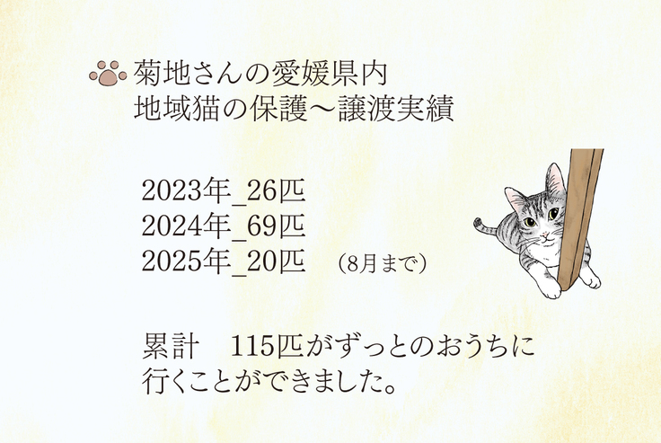 個人ボランティアとして愛媛県で保護ネコ支援の活動する菊地智江 さんを支援するプロジェクトです。