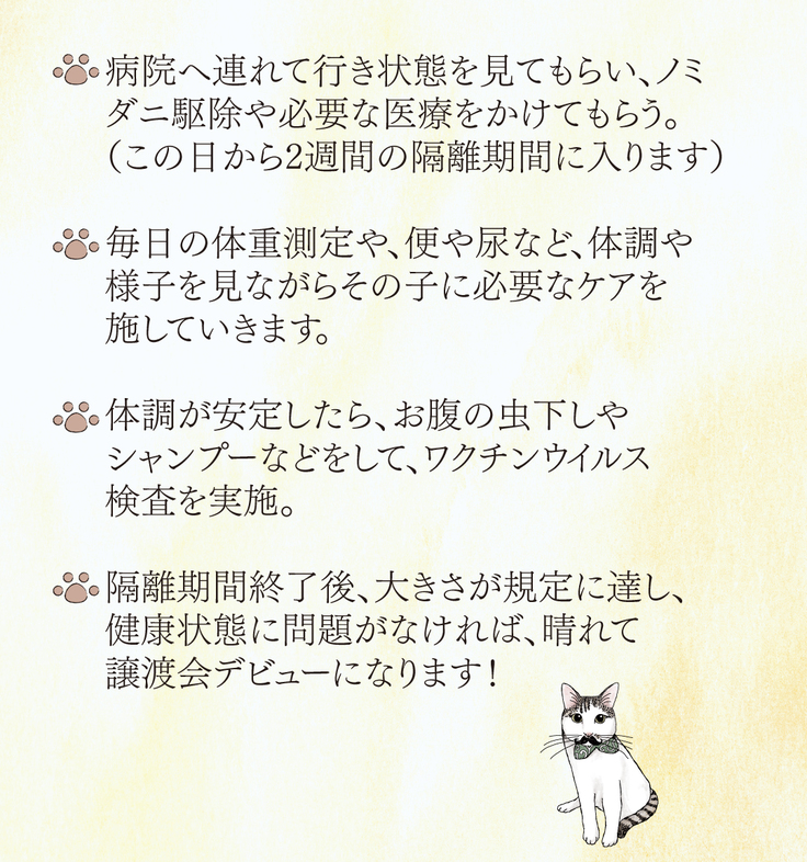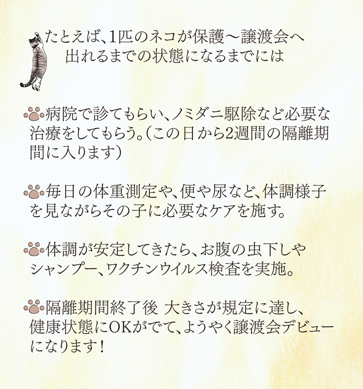 保護された子たちは万全な状態になれるよう、こんなにも多くの段階を経てようやく譲渡会へと行けるのです。
