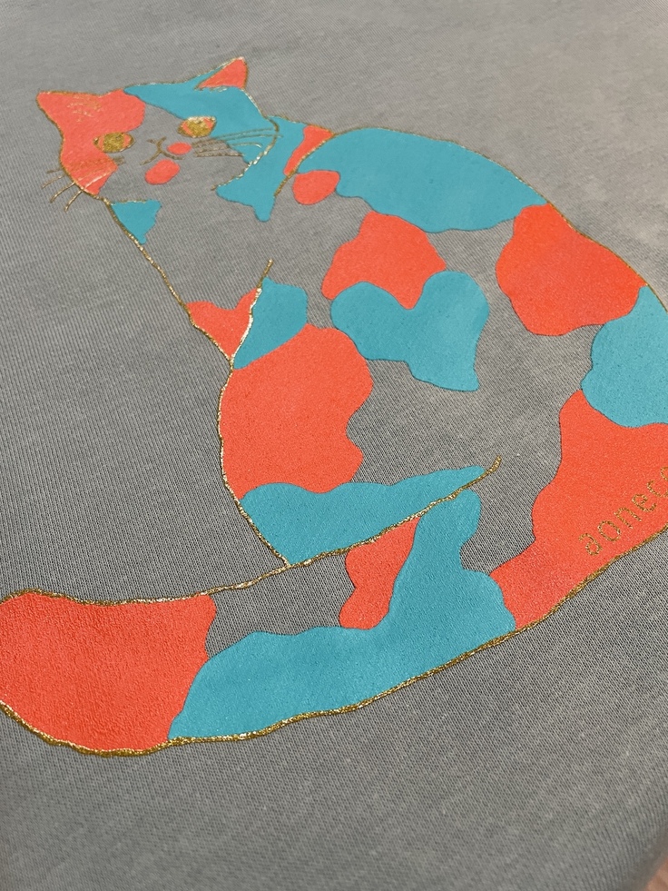 これからの季節に重宝しそうな生地厚で、3カラーで三毛猫を表現したデザインをちょっとだけお見せしますね。