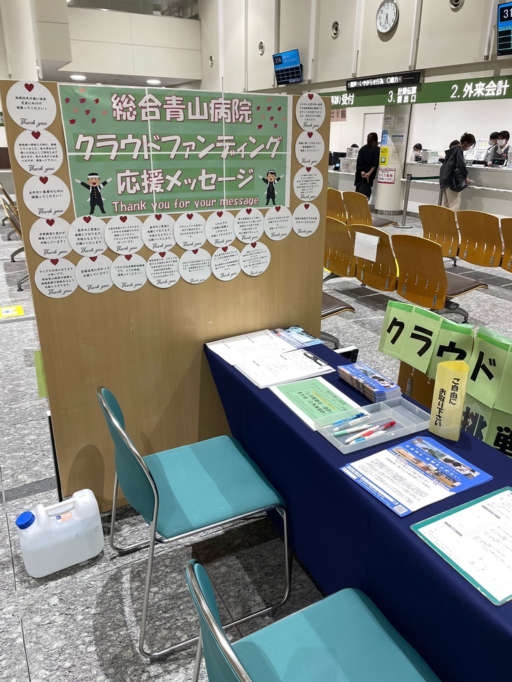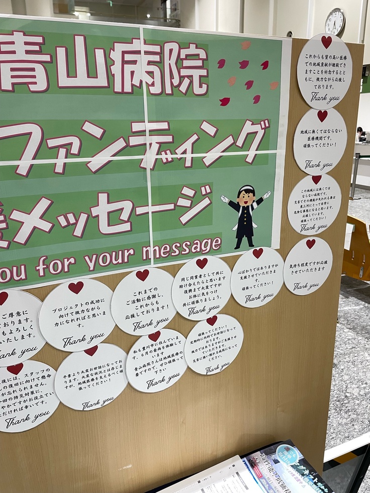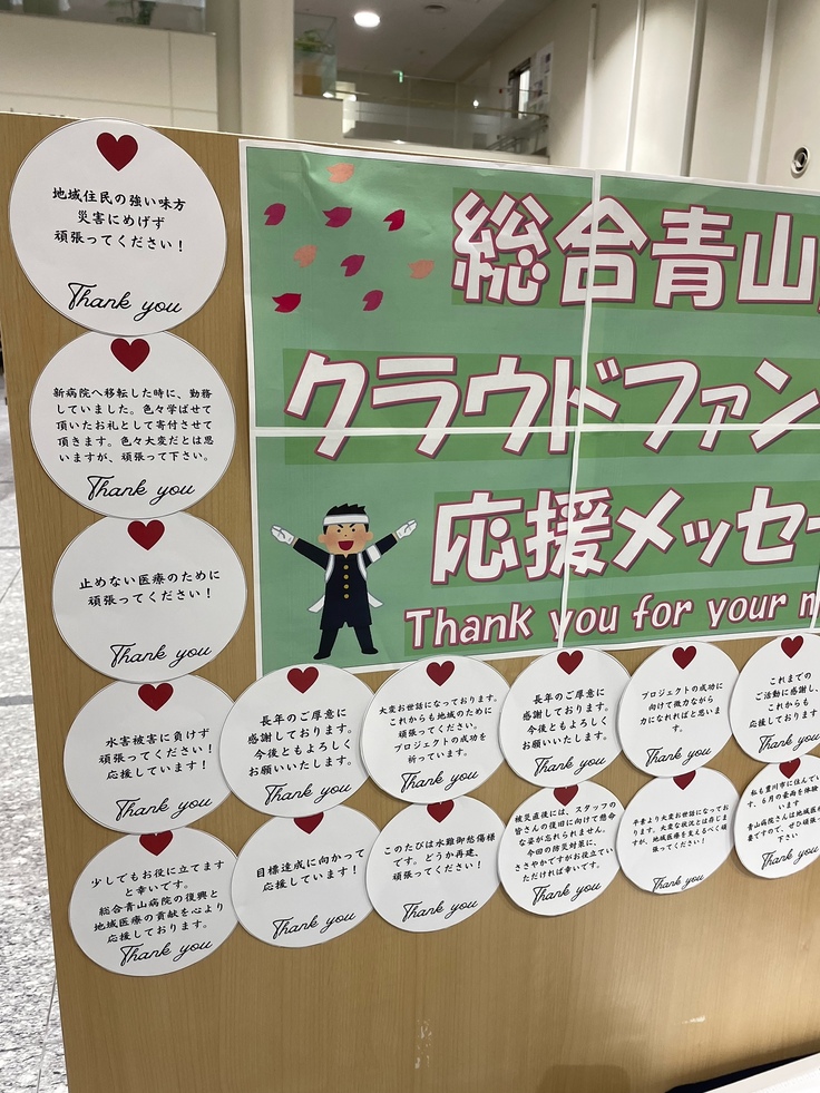 外来ホールのクラウドファンディングブースに応援メッセージを掲示いたしました。職員一同プロジェクト達成に向けて一丸となってまいります。引き続き皆さまのご支援ご協力をお願いいたします。