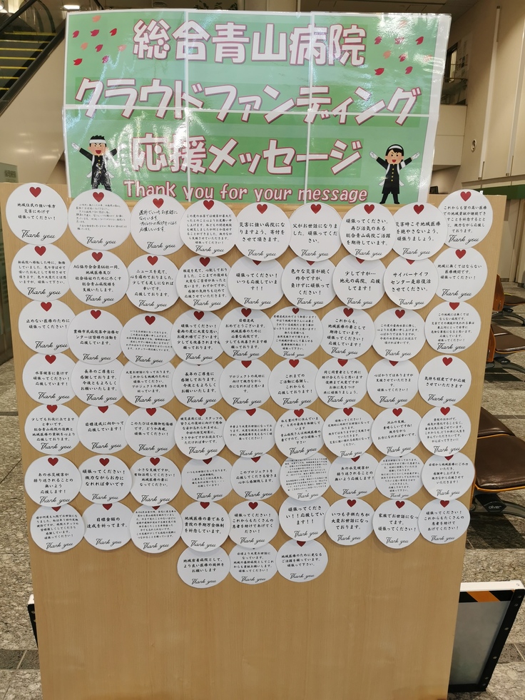 当院のクラウドファンディングの挑戦に対する皆様の支援では、同時に多くの熱い応援メッセージをいただきました。そのうちの一部ですがメッセージボードにちりばめ、外来待ち受けホールに掲示して、来院される患者様やご家族に見ていただけるようにしました。