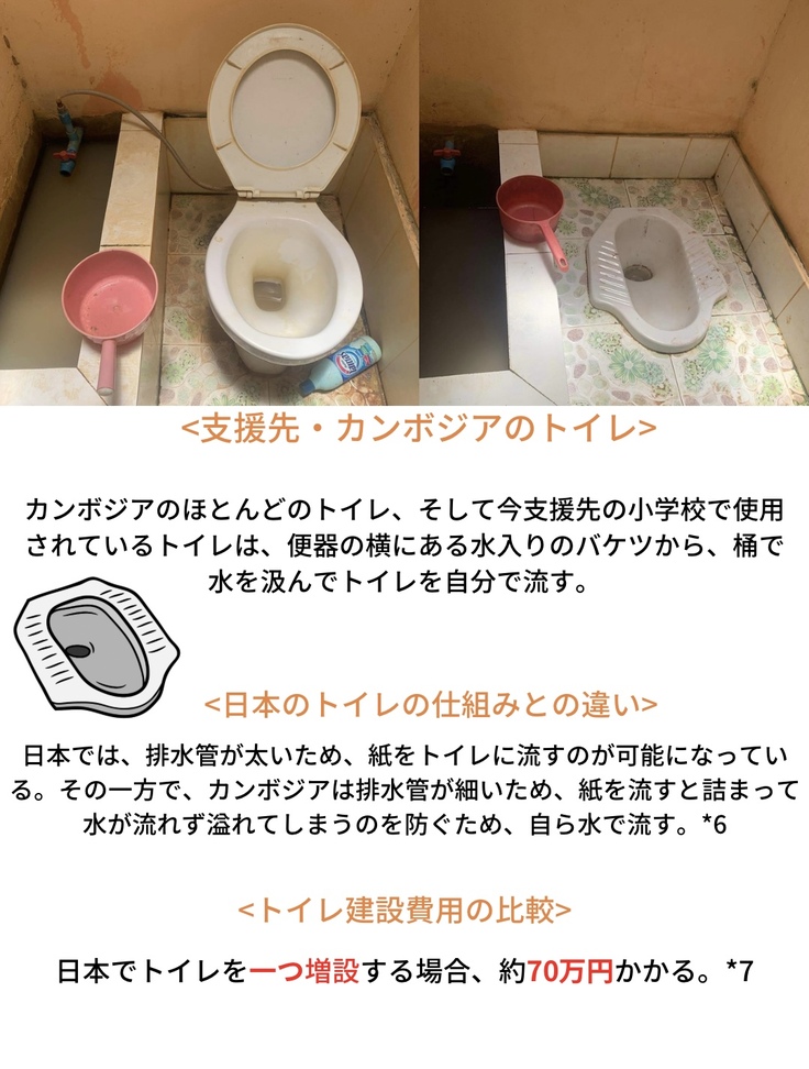 上記の資料をご覧いただくと、カンボジアでは性能は違えど日本ほどの費用をかけずにトイレを建設することが可能であるということがわかります。同じ金額で、日本では1つのトイレを建設することができますが、カンボジアでは5つも建設可能なのです。