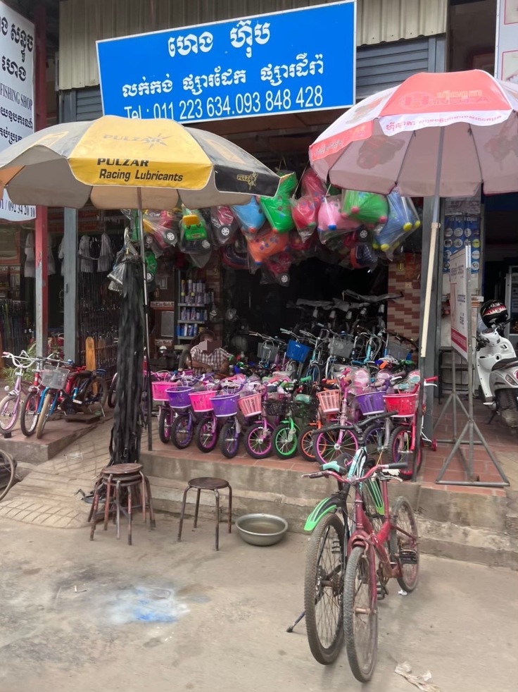 カンボジアでは街中に自転車やバイクを販売しているお店が多くみられました。黒や白だけでなく、ピンクや緑などカラフルな色の物もありとても素敵でした。