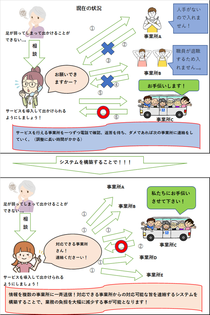 ケアマネジャーが新規で事業所を探す際、システム内で情報を発信→対応が出来る各サービス事業所に自動的に情報を発送。
