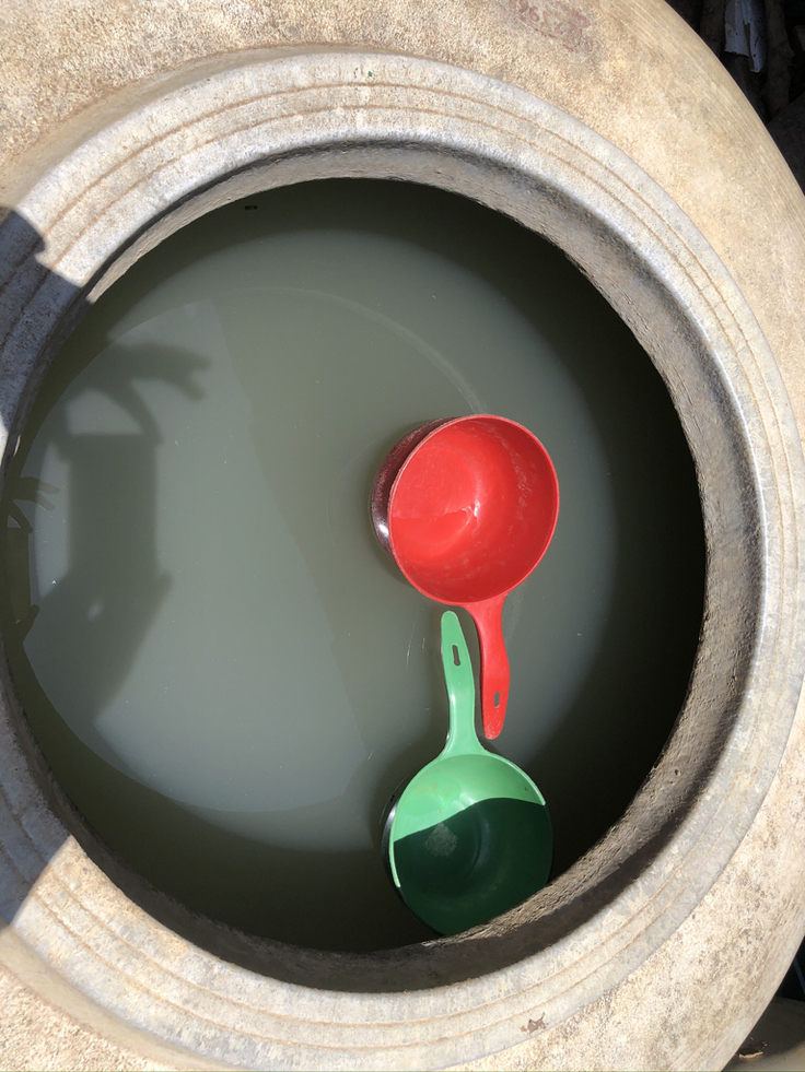 家庭で使っているのは、こんな瓶の中に貯めている雨水。