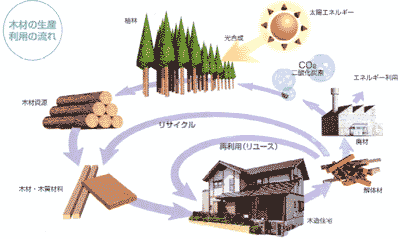 木材は、再使用や再利用できるのはもちろんですが、さらに、森林から再生産することができる貴重な資源です。