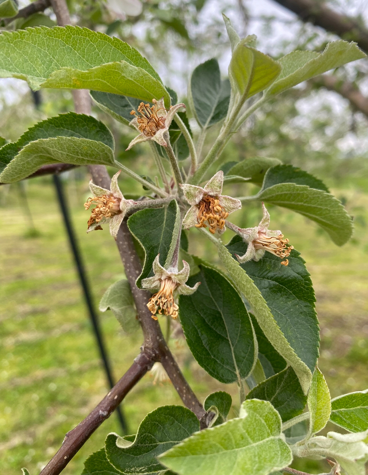 急激に寒くなる日がたまにあって、気温が氷点下まで下がったりすると、霜が畑にたまって、一気に林檎の花がから落ちてしまうという災害になります。😭
