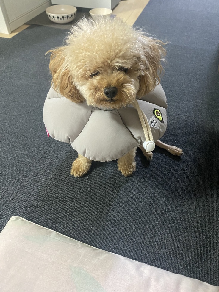 手術の傷跡が痒いのか、かさぶたになってるところペロペロ舐めまくるのでカラー装着しました!
