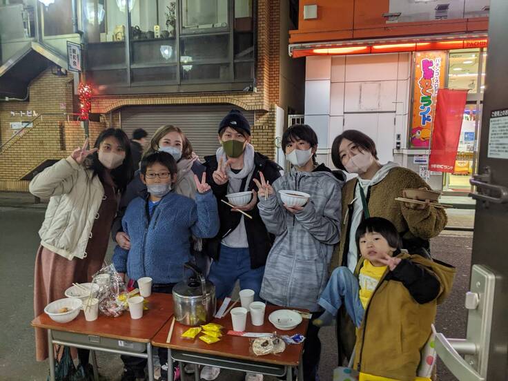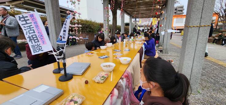 長後駅の東口ロータリーに12メートルのこたつを作り、こたつを囲みながら地域多世代交流を開催しました。