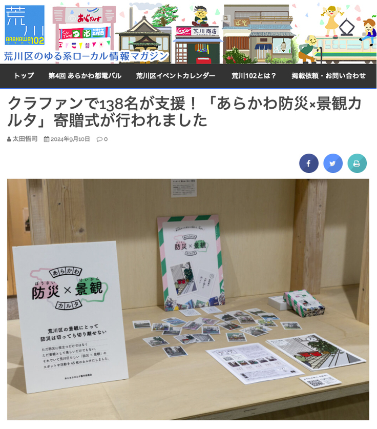 荒川区の地域メディア「荒川102」にて、「あらかわ 防災×景観 カルタ」寄贈式の記事が掲載されました!