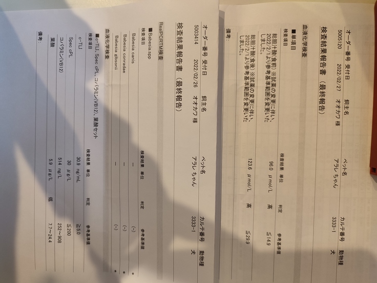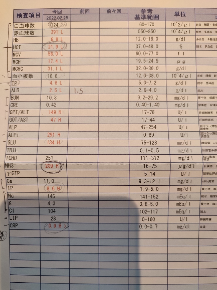 次の日、アラレ迎えに行き、先生とお話ししました。血液検査の結果、レントゲンなどを見て、先天性門脈シャントの可能性が高いと言われました。CTを撮らないと確定ができないみたいなのでCTのある病院を予約していただきました。血液検査の結果をのせておきます。