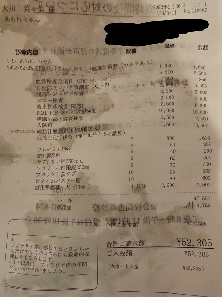 今までの通院、検査など、そしてアラレが元気に帰ってきてからもこれからも治療費はかかると思います。