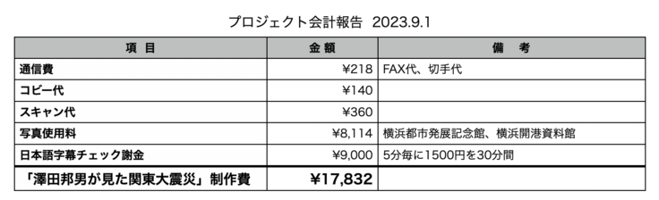 「澤田邦男が見た関東大震災」制作費