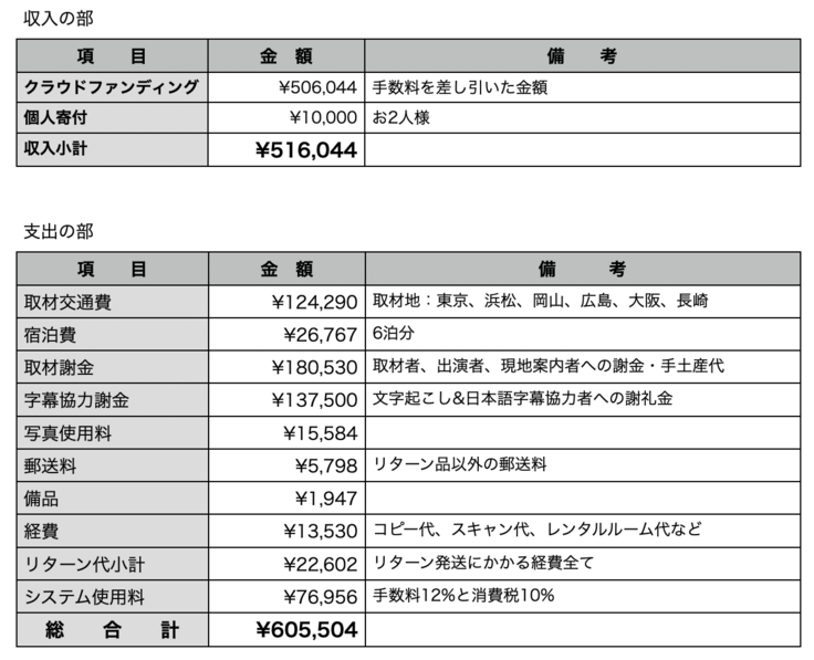 会計報告の方です。クラウドファンディング成立後、本日までにかかった費用は605,504円となります。内訳は下記にご確認お願いいたします。