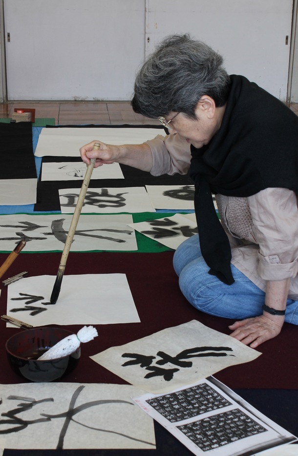 最初に書にまつわる基本的なお話を聞き、その後は大きな毛氈に身体ごと乗って、まずは自由に筆を扱うための