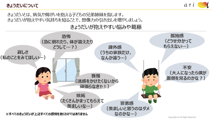 「きょうだい」であるS君は、「普段、妹に風邪をうつさないために外出を控えたり、友達もその事情を分かってもらえないから家に友達を呼びづらいんだ。だから、遊びに行けないんだ」と教えてくれました。