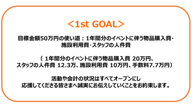目標金額100万円の使い道は、1年間分のイベントに伴う物品購入費・施設利用費・スタッフの人件費に充てさせていただきます。